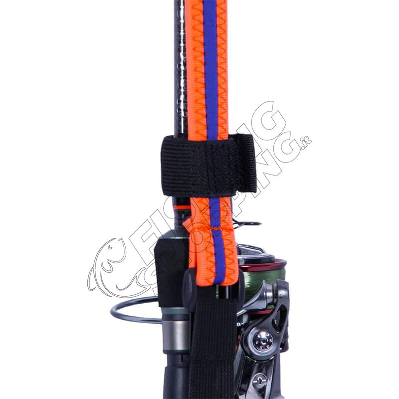 Una fascetta centrale con chiusura in velcro mantiene la canna perfettamente bloccata, mentre le zone di contenimento sugli apici stabilizzano ulteriormente le sezioni evitando movimenti indesiderati durante il trasporto.