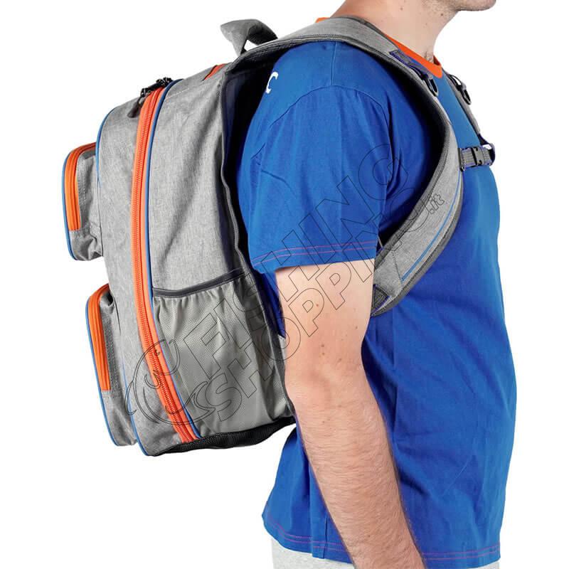 Maniglia imbottita per trasporto a manoSpallacci imbottiti e regolabili con ganci stabilizzatoriGanci posteriori e laterali di trasportoTripla zona di imbottitura posteriore traspirante per fianchi e zona lombareDue tasche frontali, di cui una con taschino internoTasca waterproof isolata per oggetti sensibiliAmpio vano principale strutturatoDue tasche interne aggiuntive: una in rete e una con zipCerniere e cursori in plastica antishockIdeale per pesca e attività outdoor impegnative